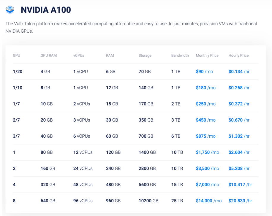 Vultr Talo是由NVIDIA GPUs和NVIDIA AI企业软件支持的虚拟化平台,其提供的GPU云服务器使用NVIDIA的多实例GPU技术,适用于具有至少10GB GPU内存的虚拟机,它通过向租户提供有保证的服务质量(QoS)、完全隔离的GPU、高带宽内存、高速缓存和专用计算核心来提升性能。